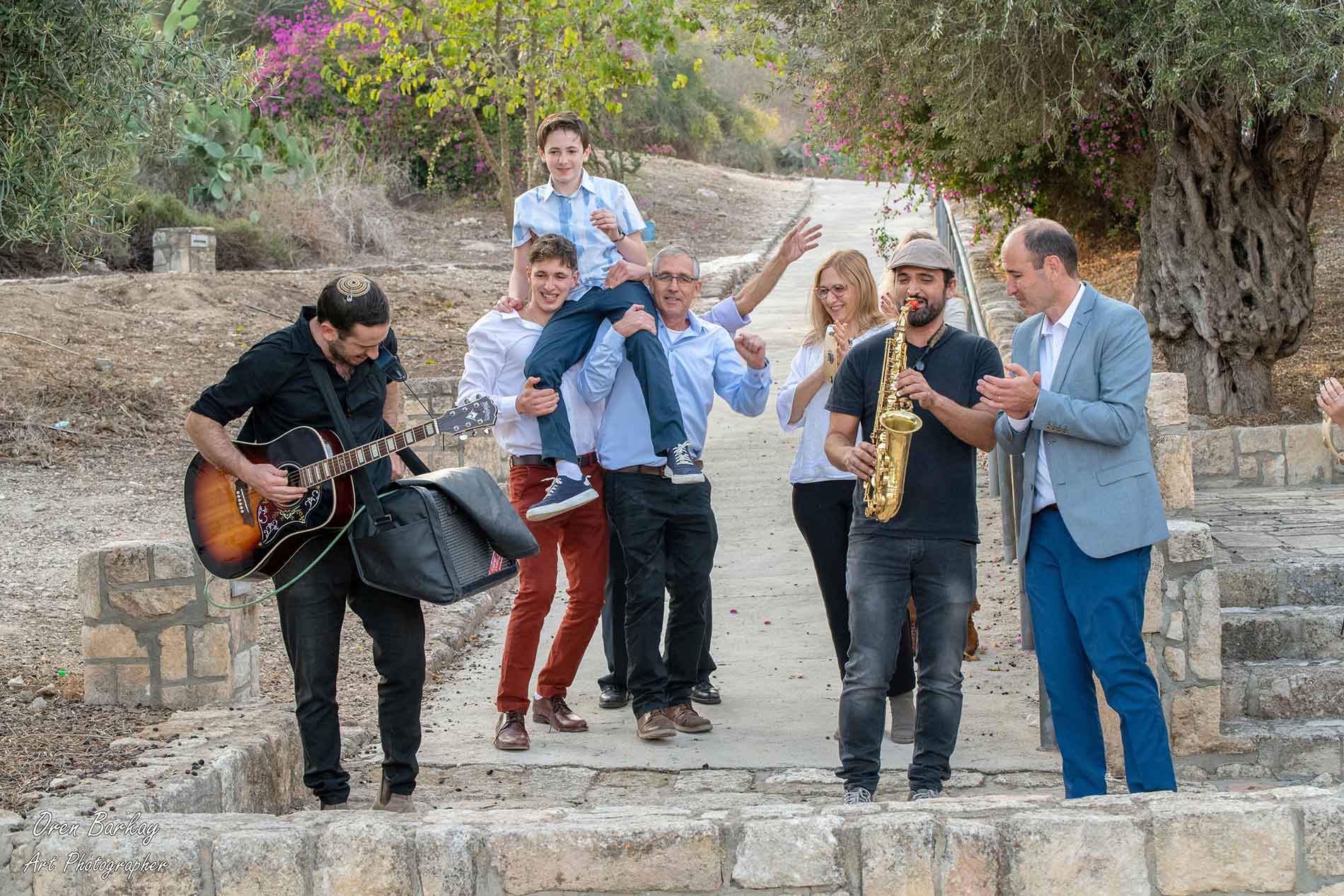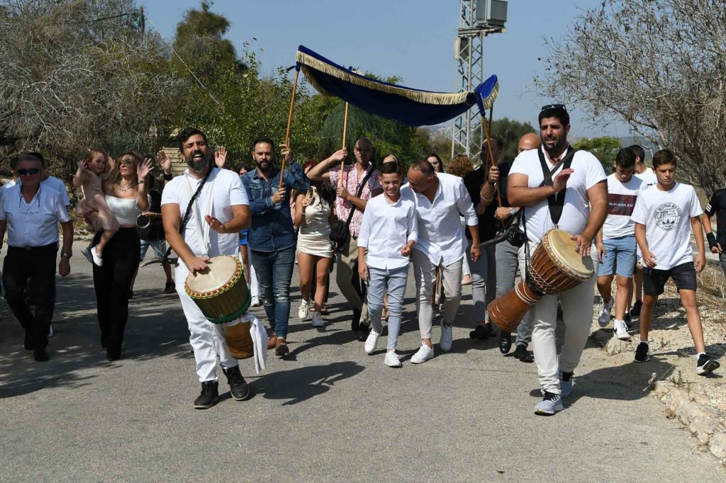 הנער מתחת לחופה שמוזיקה יהודית וישראלית ברקע, יחד עם התהלוכה שמובילה אותו